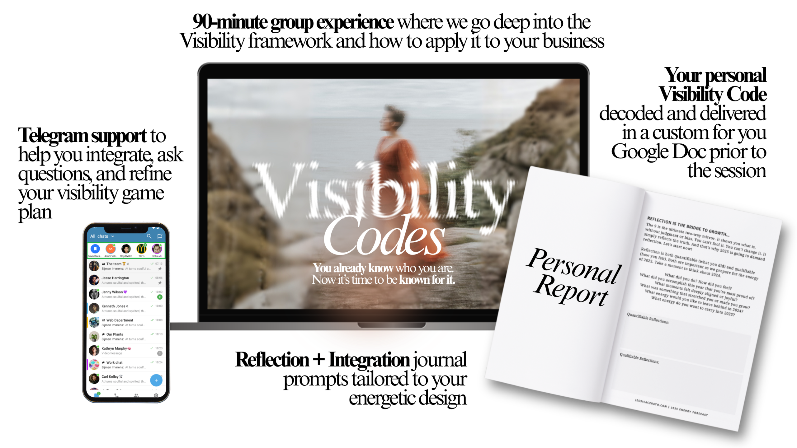 - Your personal Visibility Code decoded and delivered in a custom for you Google Doc prior to the session